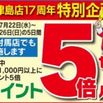 2020年7月18日 / 最終更新日時 : 2020年7月18日 tsushim@ インフォメーション ポイント5倍 美津島店開店17周年 大創業祭 7月22日~7月26日のチラシ期間中 税抜き1,000円以上お買い上げでポイント5倍!!! 上対馬店も同時開催いたします。